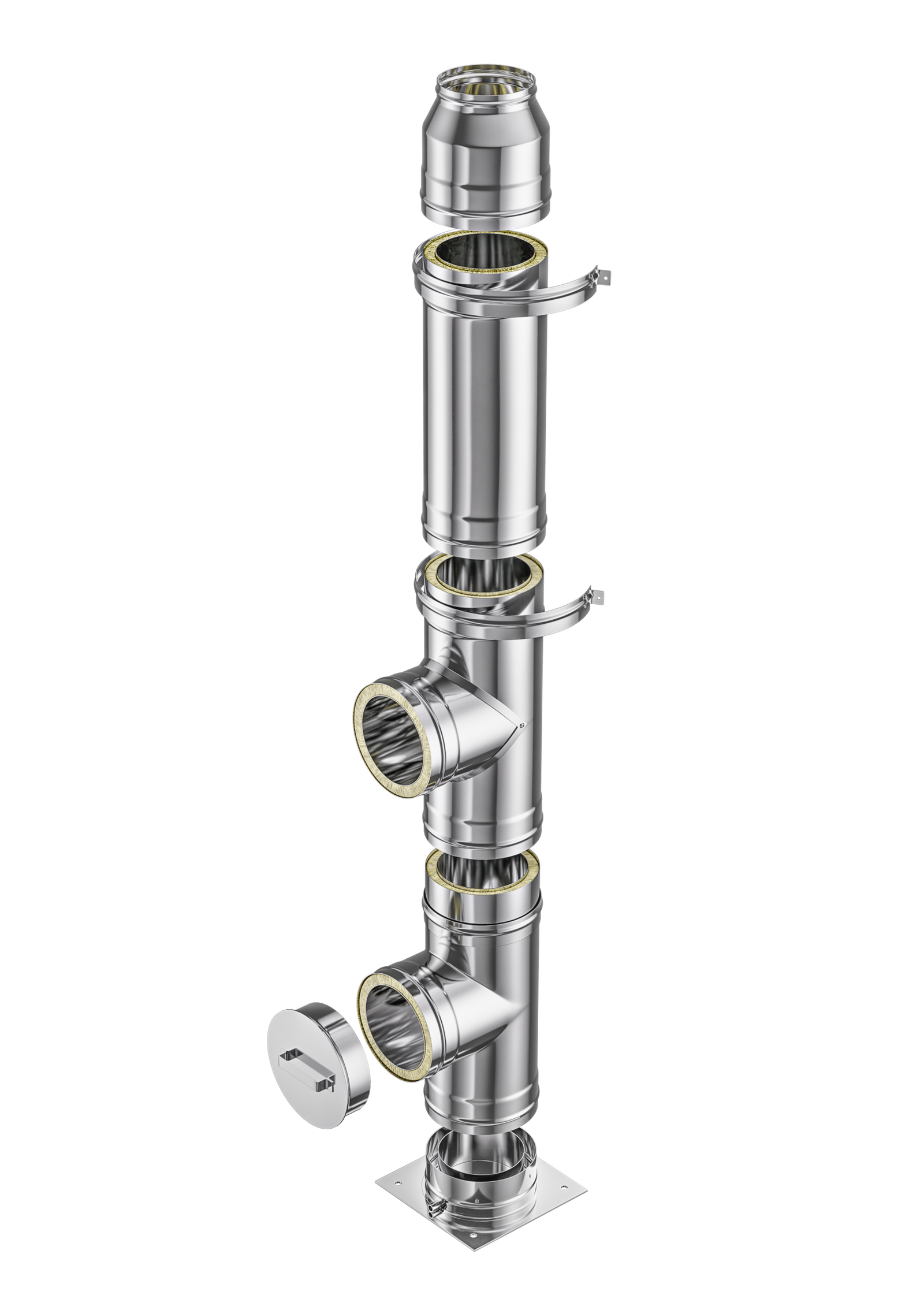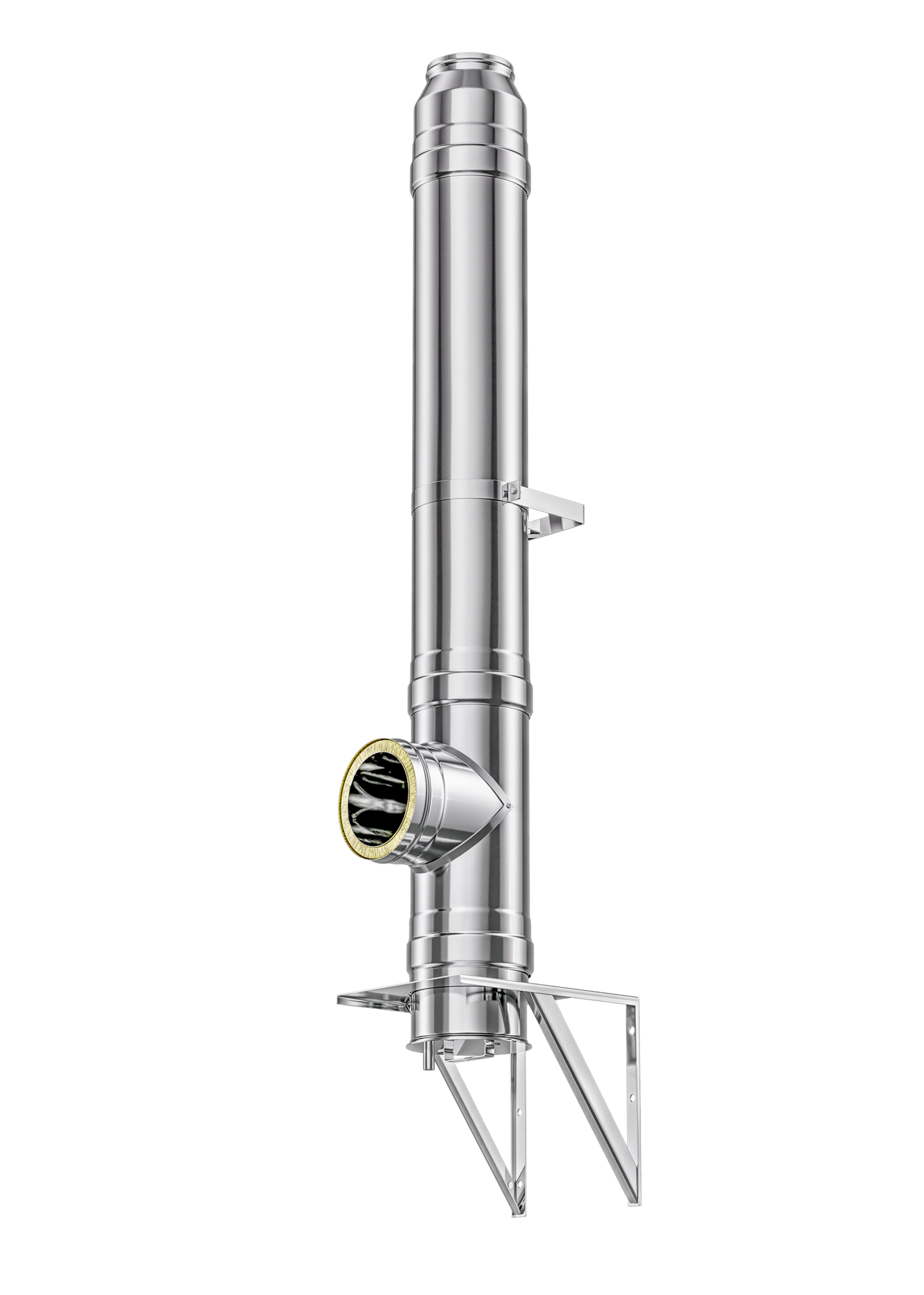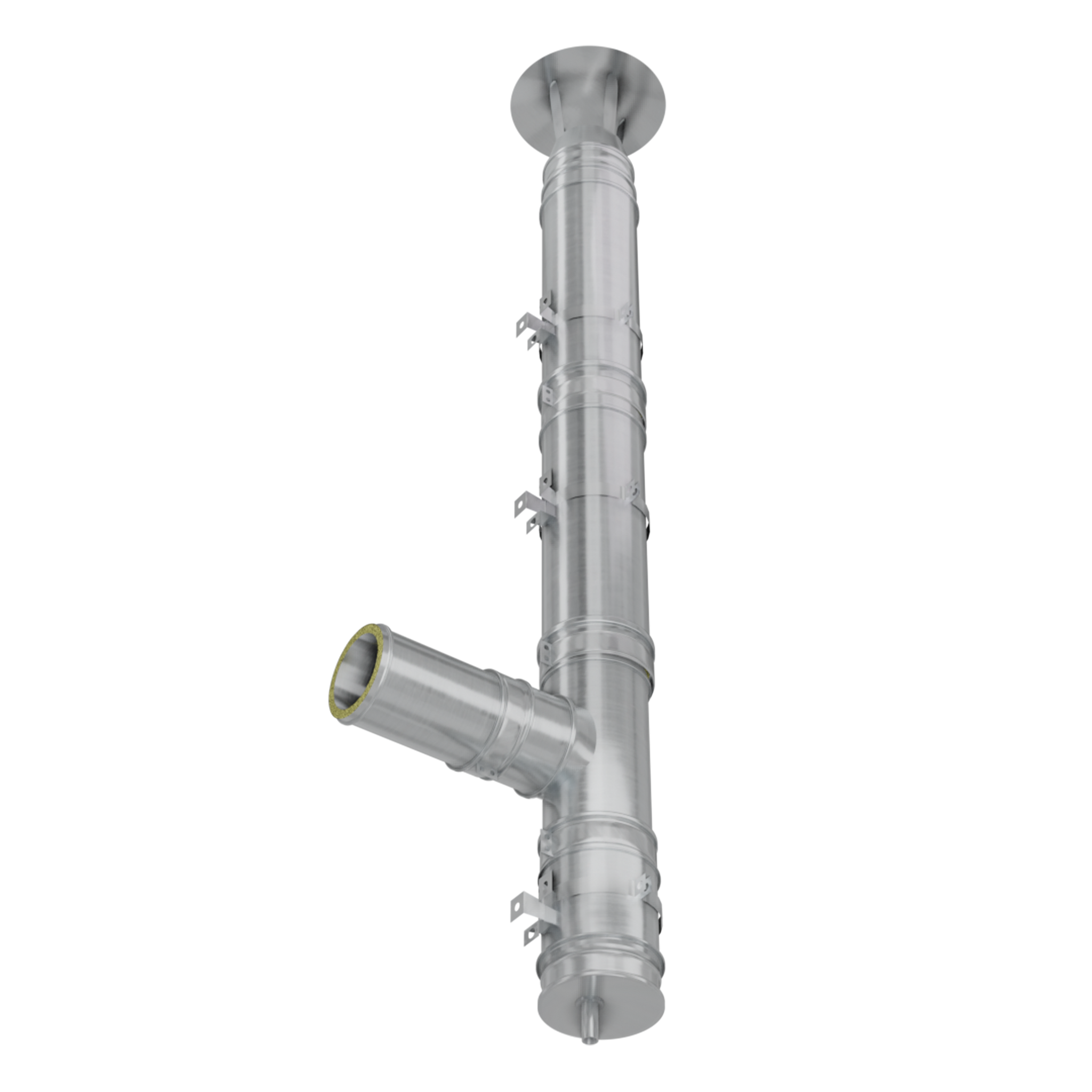 The chimney installation can start from the ground with a “Level 0” base or be suspended on the wall using fixed 3-point support brackets. The construction is of the “insulated double wall” type, featuring 2.5 cm thick mineral wool insulation with a density of 90 kg/m³.
