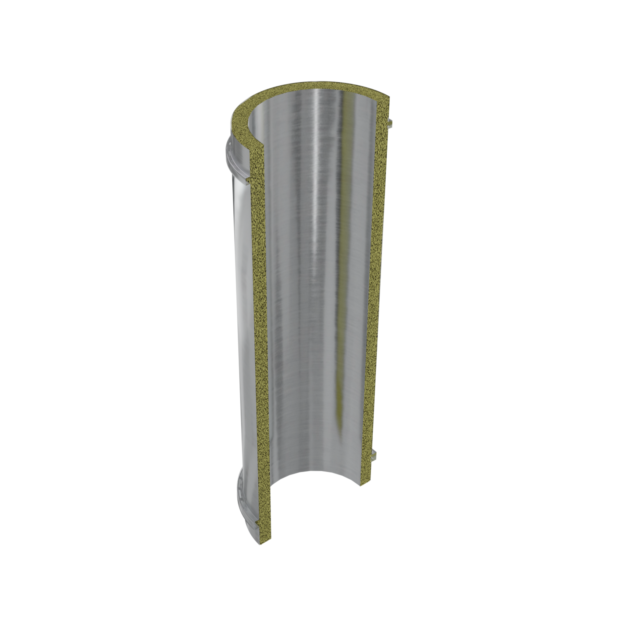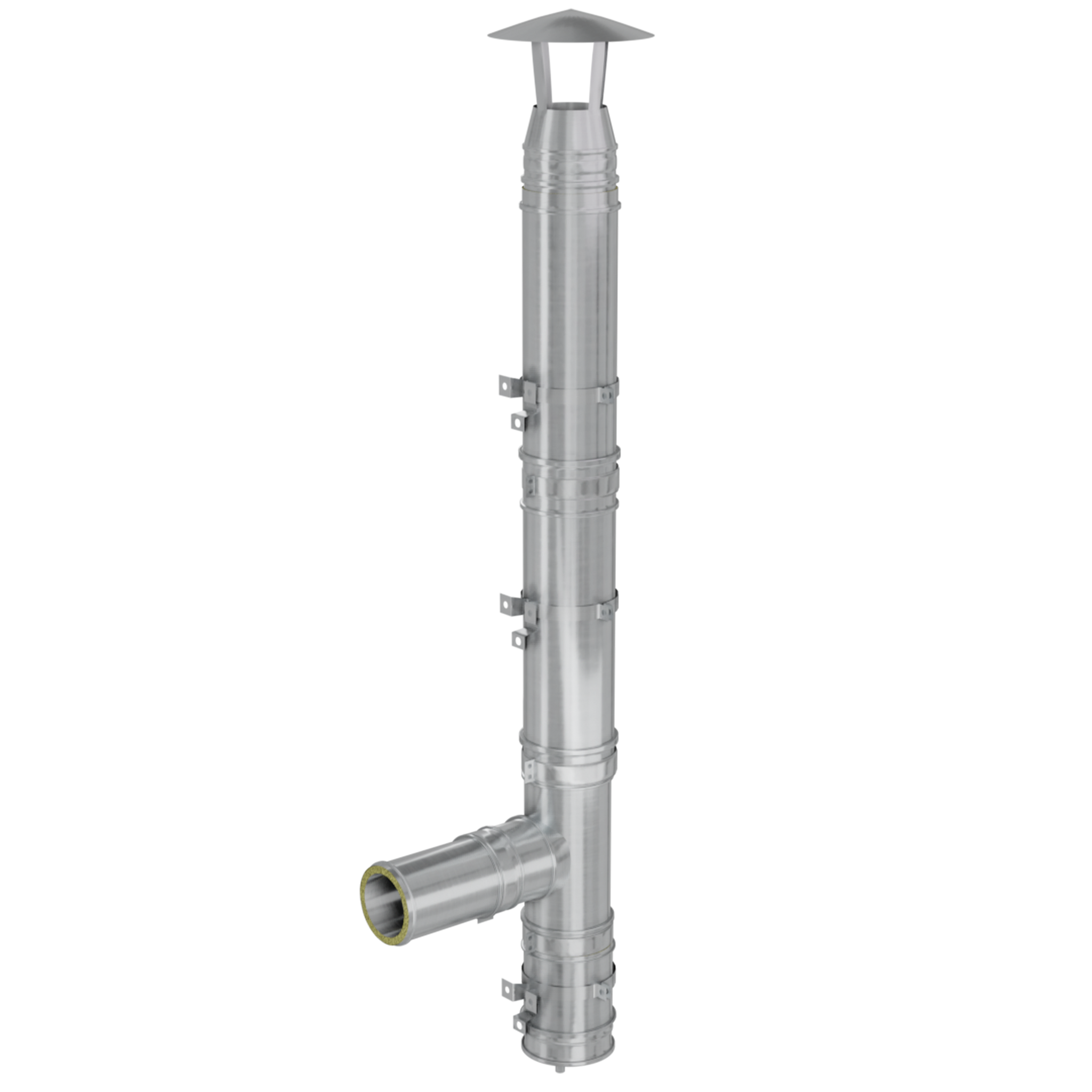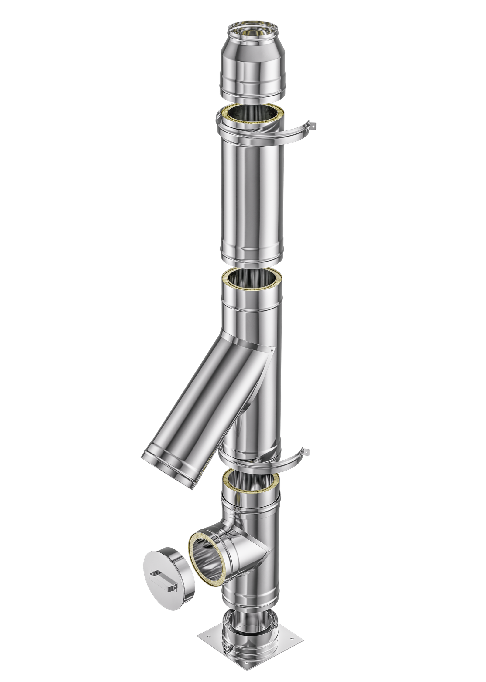 The chimney installation can start from the ground with a “Level 0” base or be suspended on the wall using fixed 3-point support brackets. The construction is of the “insulated double wall” type, featuring 2.5 cm thick mineral wool insulation with a density of 90 kg/m³.